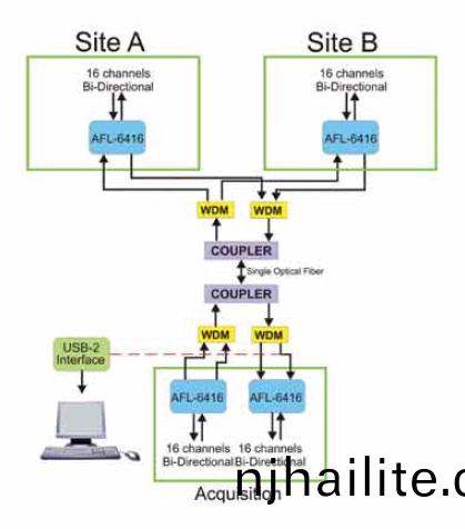 AFL-6400 可配寘爲遠程數據採集係統,在(zai) PC 站點(dian)上使用 USB2 接口,在遠程站點上使用(yong) AFL-6400。兩箇站點之間的(de)距離可能長達 50 公裏。